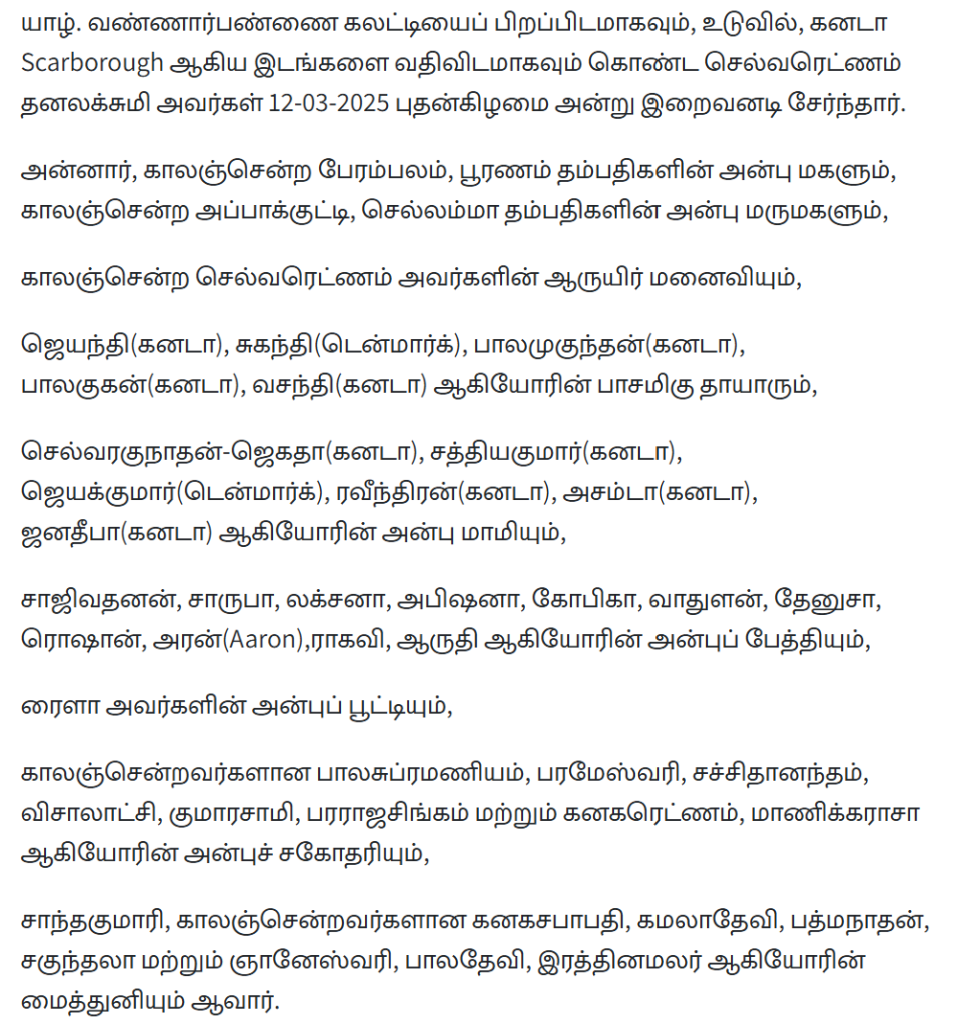 துயர் பகிர்வு: திருமதி செல்வரெட்ணம் தனலக்சுமி
